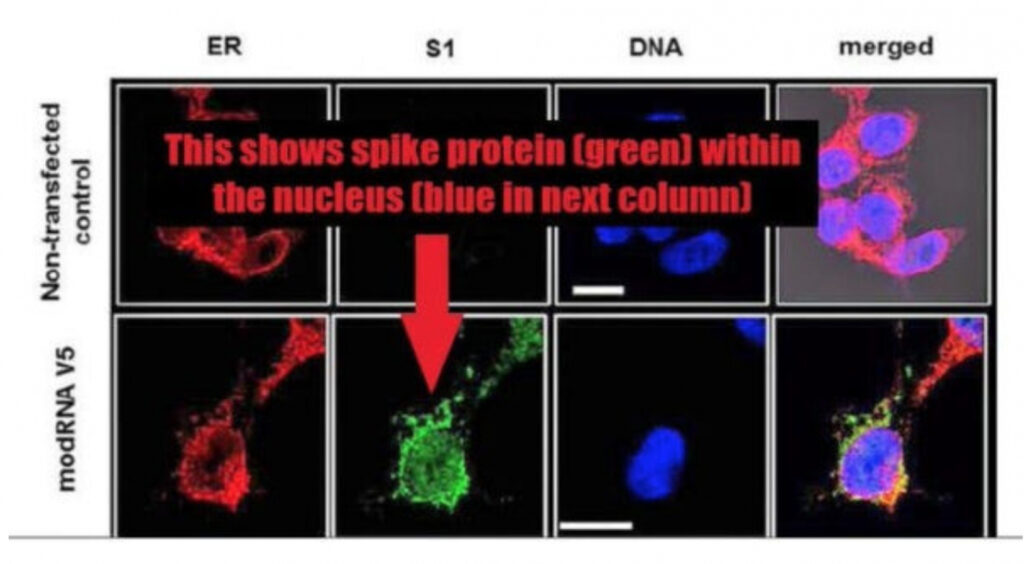 Thật không may, quá trình thử nghiệm tiêm độc tố mRNA tạo ra protein tăng đột biến (đoạn tăng đột biến có chiều dài đầy đủ khớp chính xác – axit amin đối với axit amin – chiều dài đầy đủ của protein tăng đột biến 15) trong và xung quanh nhân tế bào và được tạo ra trong ít nhất 60 ngày và gần như chắc chắn lâu hơn.